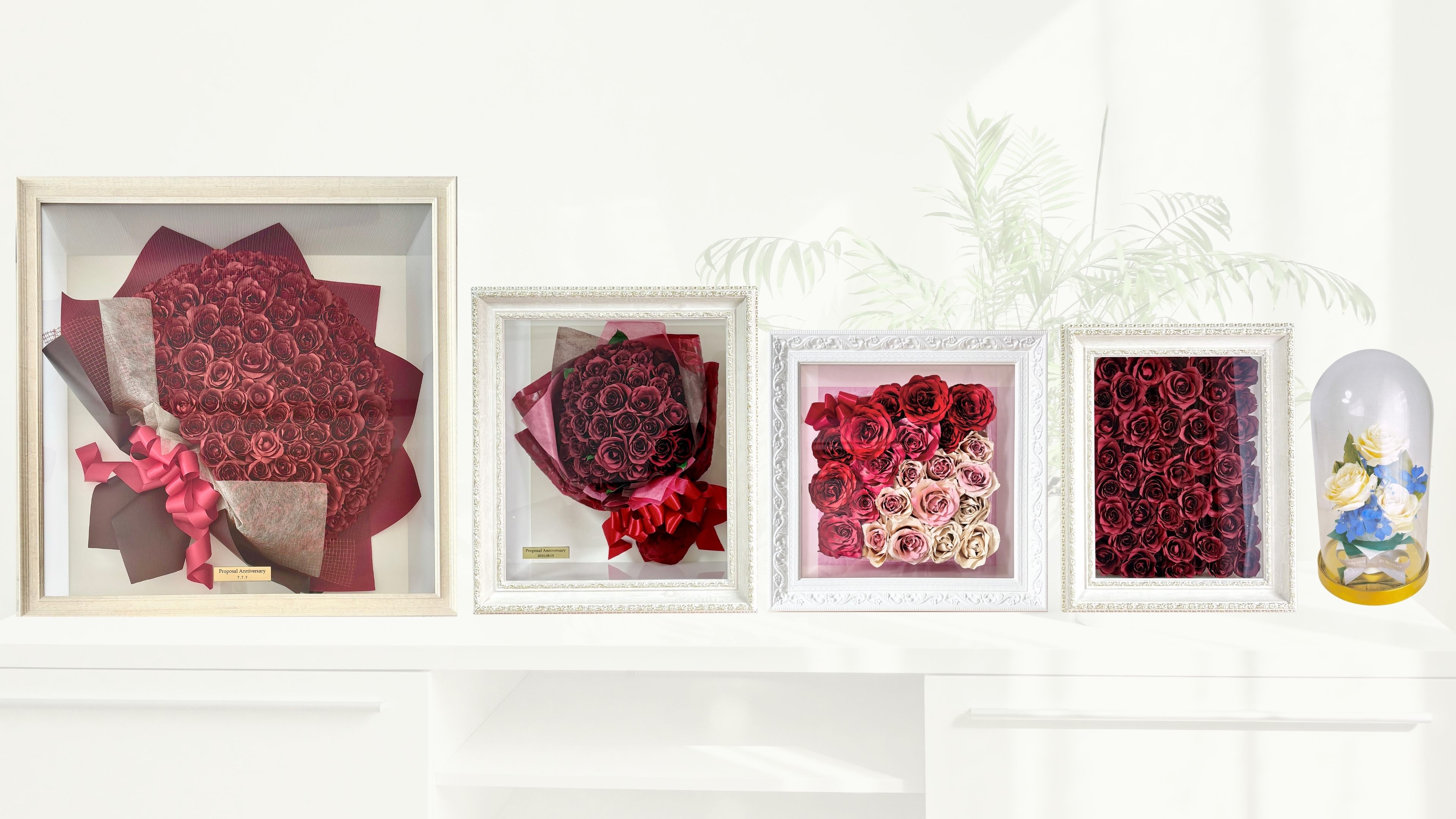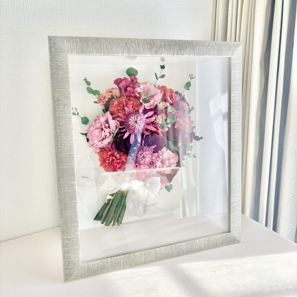 大切なお花を特殊な技術で保存加工し立体額装ボックスやガラスドームにお入れいたします。